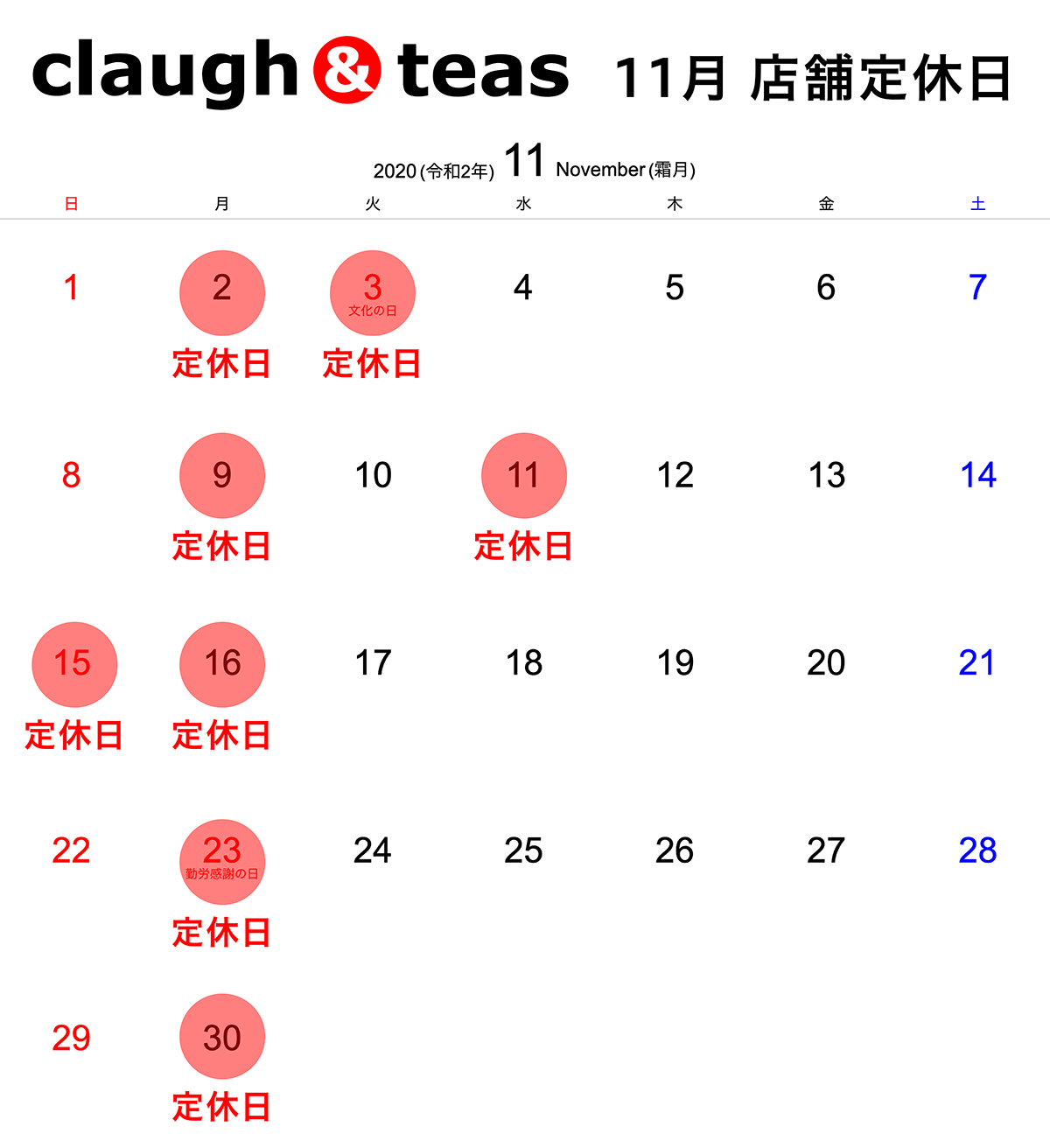 11月 店舗定休日のご案内 2020.10.21 お知らせ クラフティーズ 11月 店舗定休日のご案内 11月の店舗定休日のご案内になります。 ●赤丸は定休日となります。 寒い時期になってきましたが、皆様のご来店お待ちしております。