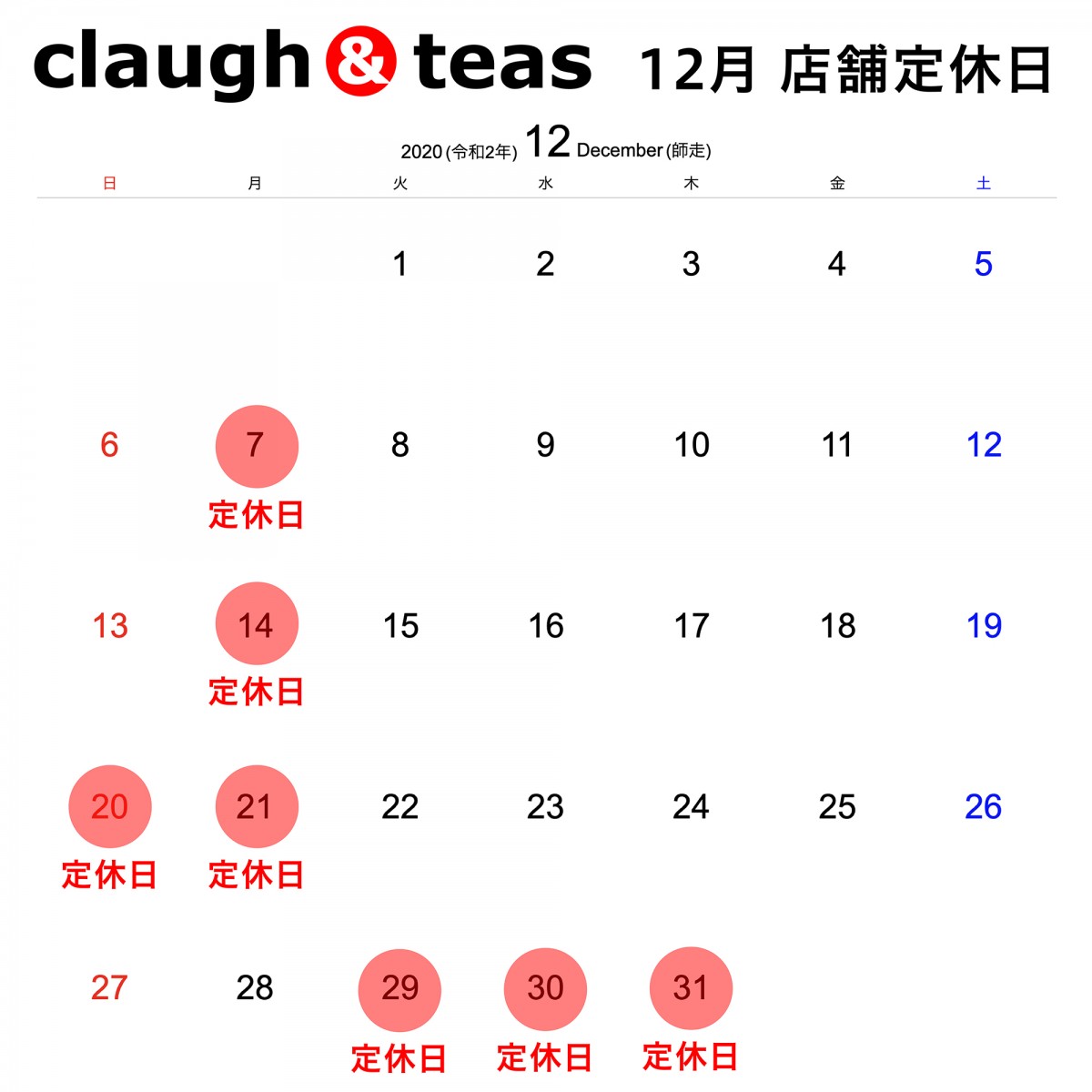 12月 店舗定休日のご案内 2020.11.24 お知らせ クラフティーズ 12月 店舗定休日のご案内 12月の店舗定休日のご案内になります。 ●赤丸は定休日となります。 2020年も残り1ヶ月!! 皆様のご来店お待ちしております。