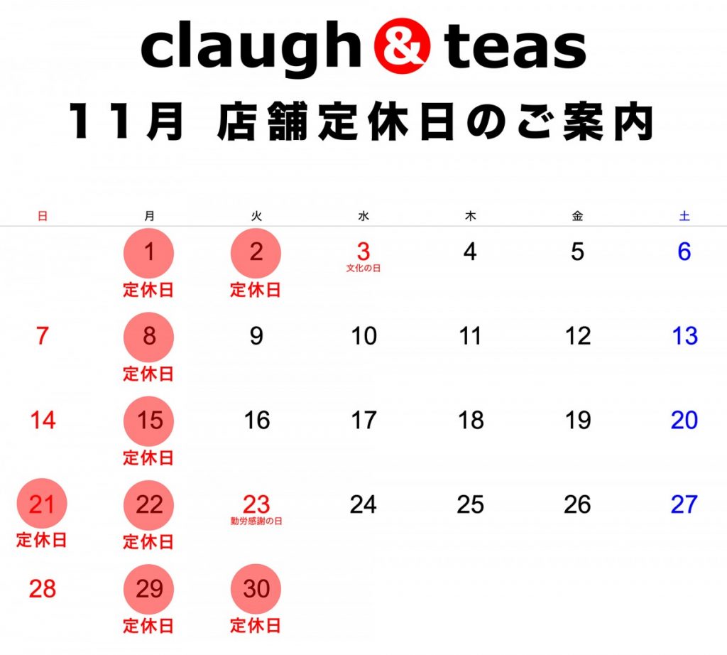 11月 店舗定休日のご案内 2021.10.27 お知らせ クラフティーズ11月 店舗定休日のご案内 2021年11月の店舗定休日のご案内になります。 ●赤丸は定休日となります。 皆様のご来店お待ちしております。