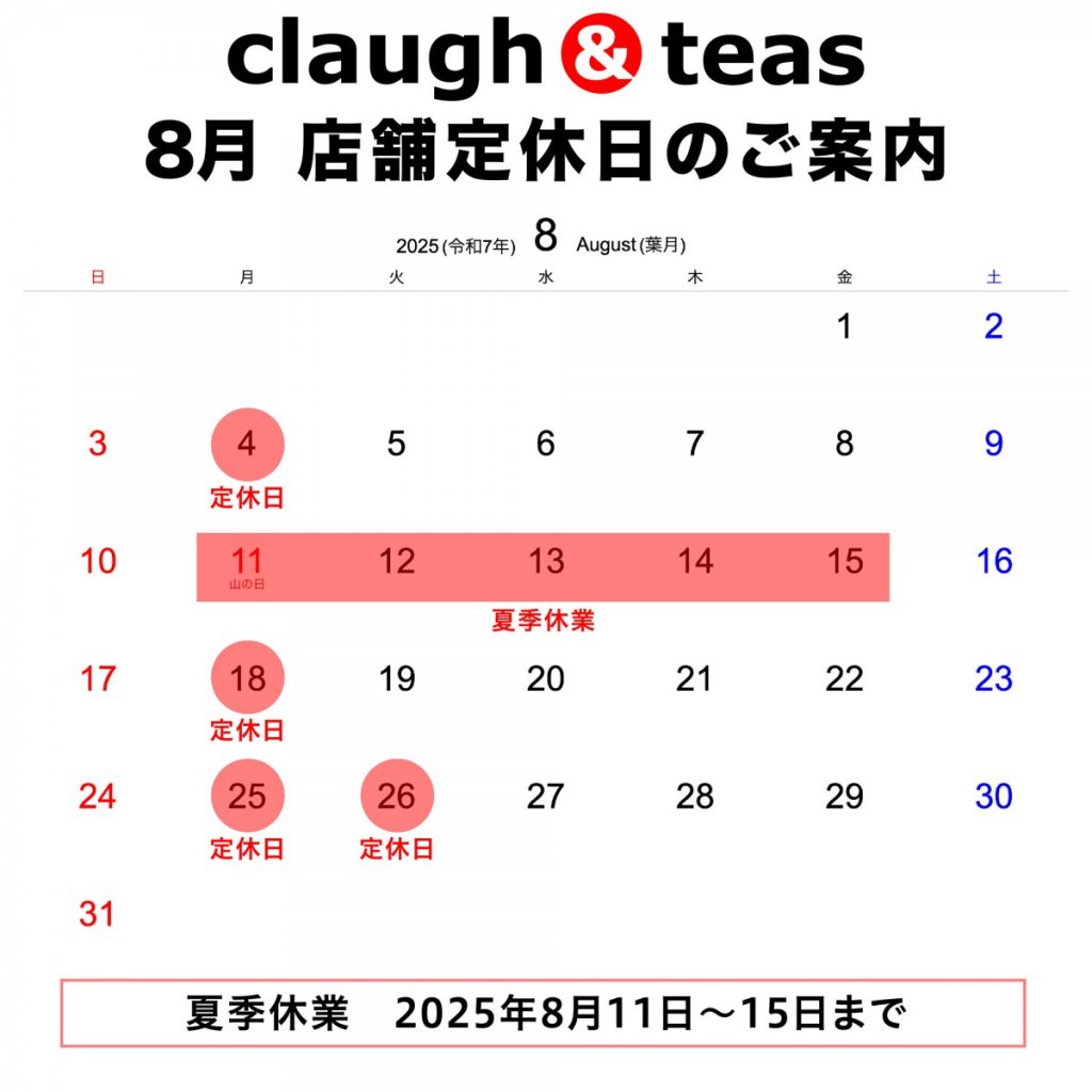 8月 店舗定休日のご案内 2025.07.16 お知らせ クラフティーズ 8月店舗定休日のご案内 2025年8月の店舗定休日のご案内になります。 ●赤丸は定休日となります。 皆様のご来店お待ちしております。 夏季休業のお知らせ 誠に勝手ながら、当店は下記の期間を夏季休業とさせていただきます。 2025年8月11日(月)〜8月15日(金) ご不便をおかけいたしますが、何卒ご理解のほどよろしくお願いいたします。