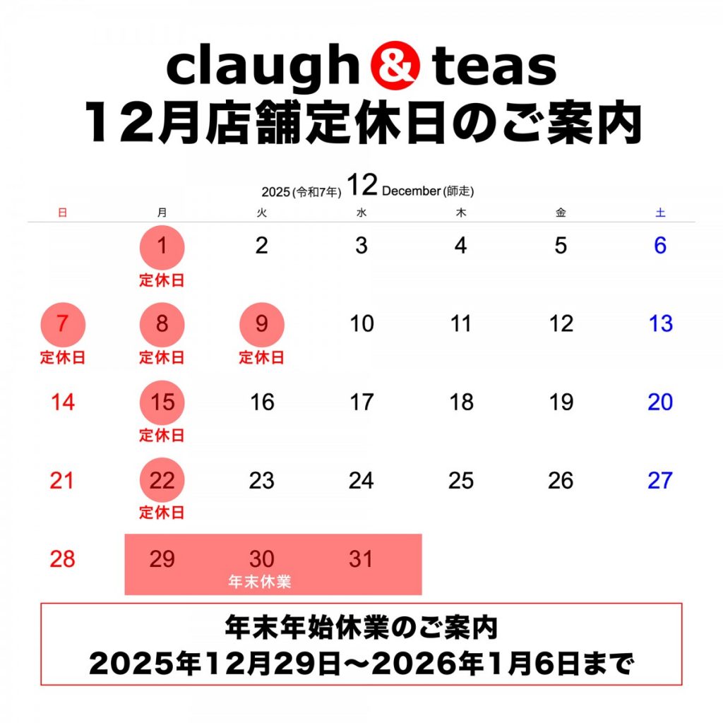 12月 店舗定休日のご案内 2025.11.21 お知らせ クラフティーズ 12月店舗定休日のご案内 2025年12月の店舗定休日のご案内になります。 ●赤丸は定休日となります。 年末年始休業 2025年12月29日〜2026年1月6日まで 皆様のご来店お待ちしております。